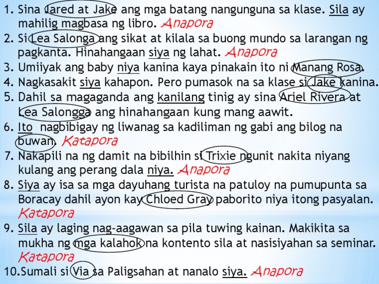 Magsulat ng sampung halimbawa ng anapora at katapora anapora12345 katapora12345. Ito ay sumalungit sa katapora na nakabaligtad ang tinutukoy at ang larawan nito. Ang Maynila ay may makulay na kasaysayan 2Siya ang dahilan kung bakit nabasag ang.