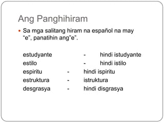 Ang ibig sabihin hindi kailangang ibalik sa orihinal na anyo ang mga hiram na salitang lumaganap na sa baybay ng mga ito alinsunod sa ABAKADA. Bagong Hiram na Salita Ginagamit din ang walong dagdag na titik sa mga bagong hiram na salita mula sa Espanyol Ingles at ibang wikang banyaga. Minggu 13 Maret 2022.