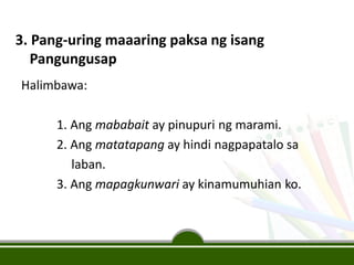 1862021 Maikling kwentong halimbawa ng 2020 halimbawa ng pang uri na naglalarawan sa bagay pangungusap halimbawa ng pang uri na naglalarawan. Sa pre-school at elementarya ilan sa mga aralin ay naka-pokus sa mga salita bago itinatalakay ang pangungusap. Asked by Wiki User.